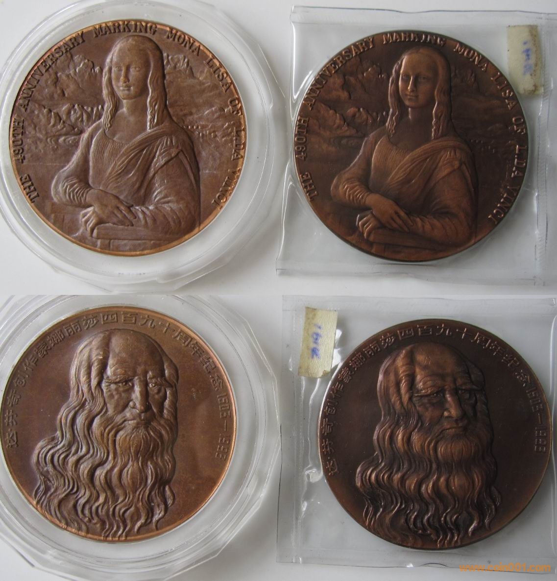 回到那天的盧工地攤,除了這枚章以外,還有一枚達芬奇創(chuàng)作蒙娜麗莎四百九十周年的章十分吸引我。話說普通的這枚章很常見,只有300多元的價格,但是地攤上的這枚章確十分的特別,在章的最外面有一圈很均勻的淺顏色環(huán),見圖8,9,10 。這讓我感覺到有些蹊蹺,一問價格,只有小幾百,毫不猶豫的買下了?;丶乙院?,我和我原來的一枚達芬奇章對比了一下,發(fā)現(xiàn)顏色明顯較淡,見圖11 。對于最外圈光亮的一圈百思不得其解。我便把照片發(fā)給幾位大銅章的老前輩詢問,結(jié)果都不知原因。一個月以后,北京孫老師來滬和我一起去上幣學(xué)習(xí),我把這枚達芬奇章帶去,請幾位上幣的專家鑒賞,在幾位專家仔細查看了許久之后,他們得出了統(tǒng)一的結(jié)論。此枚達芬奇章,是用老坯餅做的,在沖壓之前,做了一道光邊的工藝,這個和流通硬幣的工藝一樣。老坯餅原來就有氧化,光邊之后把內(nèi)部沒有氧化的內(nèi)心翻出,然后再沖壓,就形成了邊緣一圈均勻的淺色紫銅本色。然后這枚章也沒有經(jīng)過最后的上色處理,就直接流出來了,他們猜想是造幣廠內(nèi)部職工手里的東西,類似于未上色的半成品。第二天上幣的專家還拿出了光邊的圖紙讓我們看,我們進一步了解了光邊的工藝。經(jīng)過這么一解釋,籠罩在我頭上一個多月的疑團解開了,同時還學(xué)到了造幣廠的工藝,真是受益匪淺。
