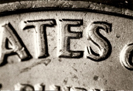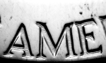 這幅照片里 AMERICA 一詞的字母上的重影是真正的重模現(xiàn)象。這是一枚 1950 精制5分硬幣。