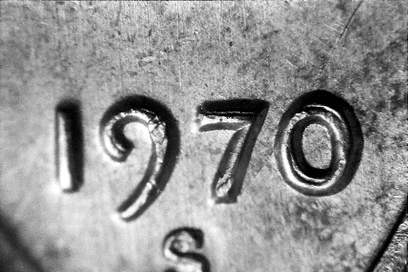 一枚 1969-S 分幣上的日期和廠記同時(shí)出現(xiàn)機(jī)械復(fù)打現(xiàn)象。這種平展、條板狀的重影經(jīng)常與前一幅照片中真正的重?,F(xiàn)象相混淆。廠記上的機(jī)械復(fù)打印記再明顯不過。重模的 1970-S 林肯分幣公認(rèn)只有寥寥幾十枚。但是帶有機(jī)械復(fù)打的 1970-S 林肯分幣卻十分常見。下面是 1970-S 分幣上真正的日期重模的照片,隨后是相同部位機(jī)械復(fù)打的照片。