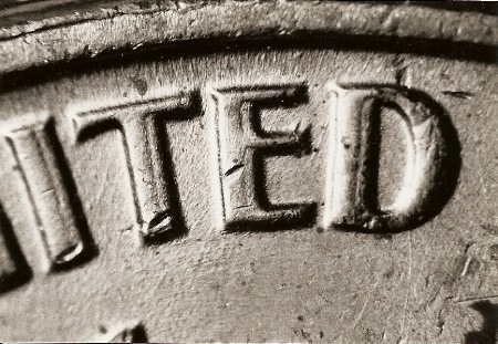 這張照片中顯示的 UNITED 一詞中的字母和上面一幅真正的重模幣照片中的字母相同,但是這里出現(xiàn)的是機(jī)械復(fù)打。請(qǐng)注意照片中平展、條板形狀的重影部分。這也是一枚 1964 年林肯分幣的背面。不難理解如果收藏者不是訓(xùn)練有素,機(jī)械復(fù)打很容易蒙混過關(guān)。