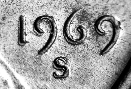 在帶有機(jī)械復(fù)打的 1969-S 分幣上,你會(huì)注意到廠記有重?,F(xiàn)象。這實(shí)際上提示了這枚不是真正的重模。 1990 年以前,廠記都是在另外一道工序中手工敲到幣模上的。雖然 1990 年以前在有廠記重模的幣上會(huì)出現(xiàn)真正的重模,但這兩種重模同時(shí)出現(xiàn)的情況少之又少。如果有人找到一枚日期和廠記上同時(shí)出現(xiàn)重模的1990 年前的硬幣,極有可能不是真正的重模。