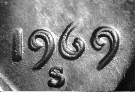 以上是 1964 年林肯分幣背面的機(jī)械復(fù)打現(xiàn)象。請(qǐng)注意重影的平展、條板狀外觀。另外 S 字母的下部也沒有開裂的襯線,字母上部的邊角也沒有任何刻痕。1969-S 林肯分幣正面的重模非常罕見,因此廣受追捧。以下是該硬幣日期上的真正重模的照片。你還將看到另外一枚 1969-S 林肯分幣上的機(jī)械復(fù)打現(xiàn)象。我們經(jīng)常聽到有人報(bào)告說發(fā)現(xiàn)了罕見的重模幣,但他們找到的實(shí)際上是非常普通的機(jī)械復(fù)打幣。
