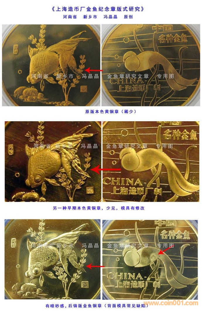 6.后鑄版章,背面(工藝畫金魚面)中心部位常見模具缺陷,這可能是上幣大量壓制、對成品精度要求不高所致,類似情況也出現(xiàn)在上幣其它品種紀(jì)念章上。早期八十年代時,造幣廠做事嚴(yán)謹(jǐn),精制紀(jì)念章產(chǎn)品售價高、鑄造要求高,極少發(fā)生這種情況;