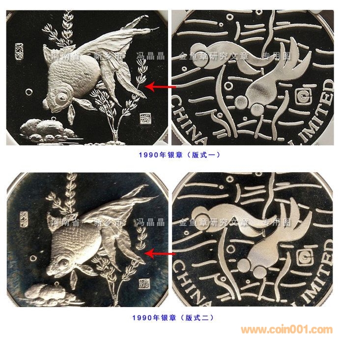 5.金魚鍍銀章,有的是有噴砂和鏡面對比的,但重量明顯比銀章要輕,銀章裸重約22.3克;“先鍍后壓”工藝,上幣開始使用的時間也較晚;