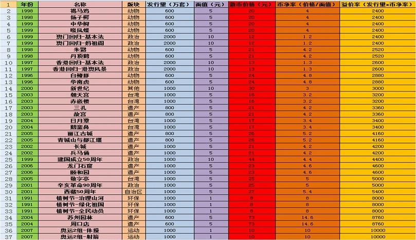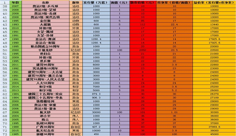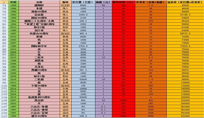 這里,我用EXCEL表格對目前發(fā)行的所有普制流通紀(jì)念幣(紀(jì)念鈔)的面值、發(fā)行量、價(jià)格(以現(xiàn)代錢幣網(wǎng)、一塵網(wǎng)近期散幣報(bào)價(jià)為準(zhǔn))進(jìn)行匯總歸納,利用函數(shù)公式計(jì)算出每個(gè)品種的“幣凈率”和“溢價(jià)率”,并根據(jù)“溢價(jià)率”從小到大進(jìn)行排序,就可以看出當(dāng)前所有紀(jì)念幣當(dāng)中哪些品種被嚴(yán)重低估、相對投資價(jià)值較高,而哪些品種已被瘋狂炒作、相對投資風(fēng)險(xiǎn)較高。