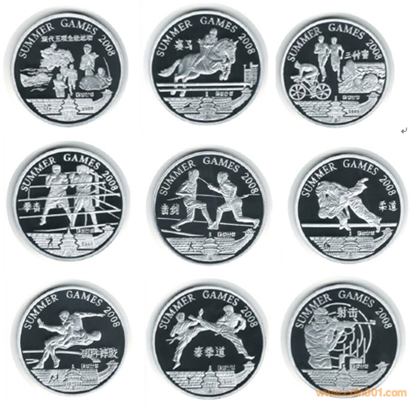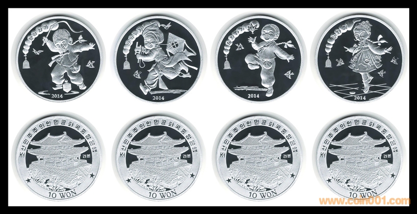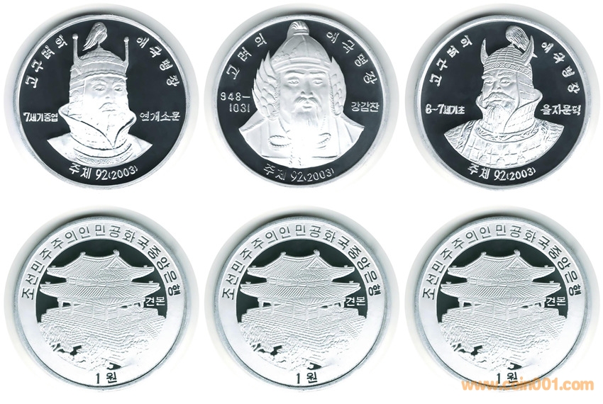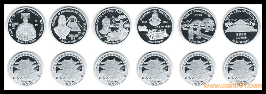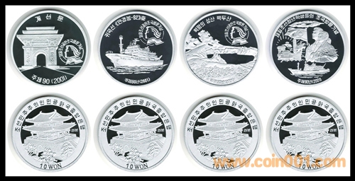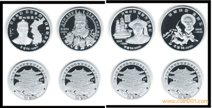 72-75. 朝鮮古代名人系列2 呈樣幣(分別是:朝鮮古代地理學(xué)家-金正浩、朝鮮高句麗時期溫祚王的父親、朝鮮鐵甲船-龜船的發(fā)明者李順心、朝鮮起義大將軍-洪范圖)